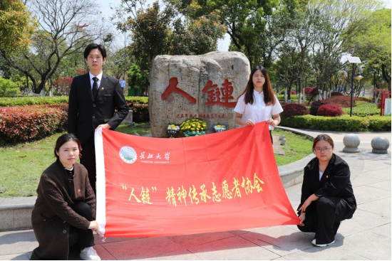 在荆江大堤宝塔湾“人链”纪念碑前,该院辅导员刘安琪带领4名员工代表前来开展江边祭扫活动。大家伫立在“人链”石碑前,低头默哀一分钟,并依次向“人链”纪念碑献花,深切悼念陈及时、何东旭、方招三位烈士。