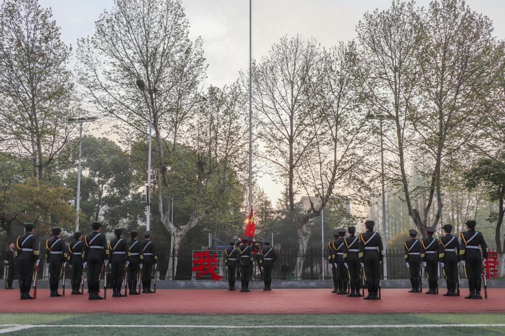 首先国旗护卫队的成员们迎着朝阳,踏着整齐的步伐,庄严的护卫五星红旗进场。7时整,在嘹亮雄浑的国歌声中,五星红旗冉冉升起,全体师生齐唱国歌,行注目礼升旗仪式到达高潮