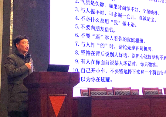 在知识方面,他指出,知识是人们在实践中获得的认识和经验,同学们既要有知识也要有文化。他建议同学们要找到最适合自己的学习方式同时要抓住课上有限的时间来高效的学习,在课后要学会整合知识点、多做练习来加深记忆。他强调,同学们重视自身德智体美劳全面发展,提升自己的综合素质。在常识方面,他说:“常识就是普遍知识。”紧接着,周俊对社交礼仪常识中的做人的原则进行了重点强调,他认为多观察、多思考、多交流是掌握常识的最好途径。在见识方面,他讲到:“见识就是要开阔自己的眼界,增长自己的知识面。” 他希望同学们能够多读一些经典的书籍、多参加一些有意义的活动以及多关注一些社会上的要闻以此来增长见识。