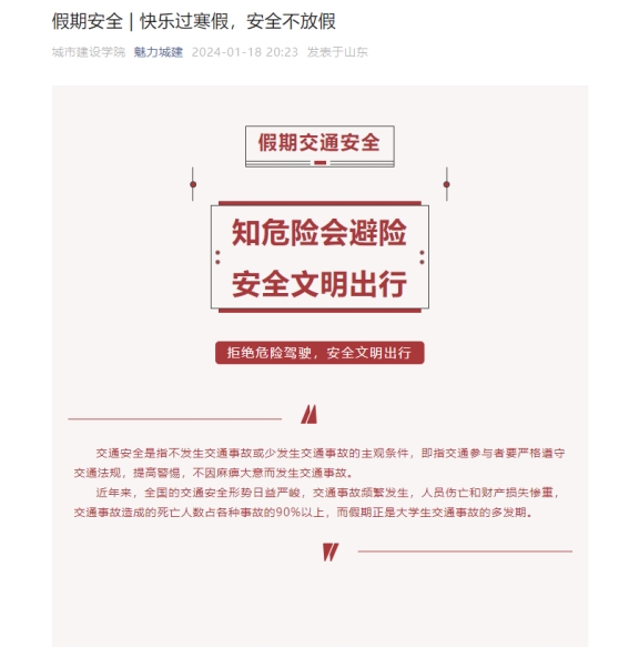 通过公司微信公众号、年级群等线上平台,编辑发布一系列温馨提示,提醒广老员工遵守交通安全规则,文明出行,共同维护良好的校园交通秩序。加强交通安全教育覆盖面同时,通过公司—班级—宿舍长三级联动、师生一对一联系等方式,做好目前在校员工晚点名工作,及时了解已离校员工安全到家情况。