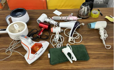 在东、西校区员工宿舍,老师们分别进入各年级寝室,对寝室用电、物品堆积、消防通道进行了细致的检查,针对寝室内使用违规电器、乱拉电线等一系列安全问题展开重点排查,现场收缴大功率违规电器,并对相关宿舍进行批评教育。