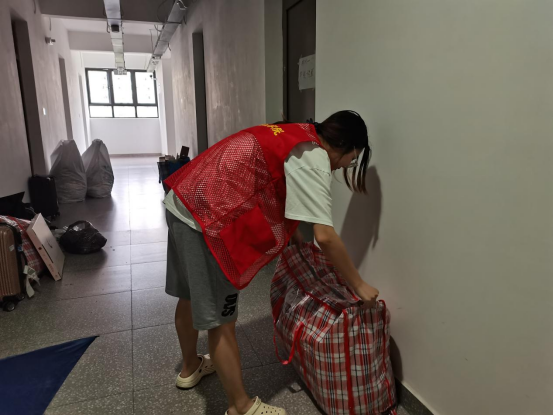 在22栋男生宿舍楼大厅、24栋女生宿舍楼大厅员工社区党员服务站前,志愿者们轮流值班为毕业生看顾、搬运行李,清扫垃圾,在炎热的夏日忙得大汗淋漓,热情却丝毫不减,爱心举动让毕业生们感到温暖。