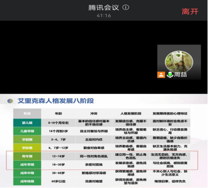随后,周喆老师介绍了艾里克森人格发展八阶段,讲解了判断各年龄阶段心理发展障碍者的方法,以便于各心理骨干更好落实班级心理健康工作。
