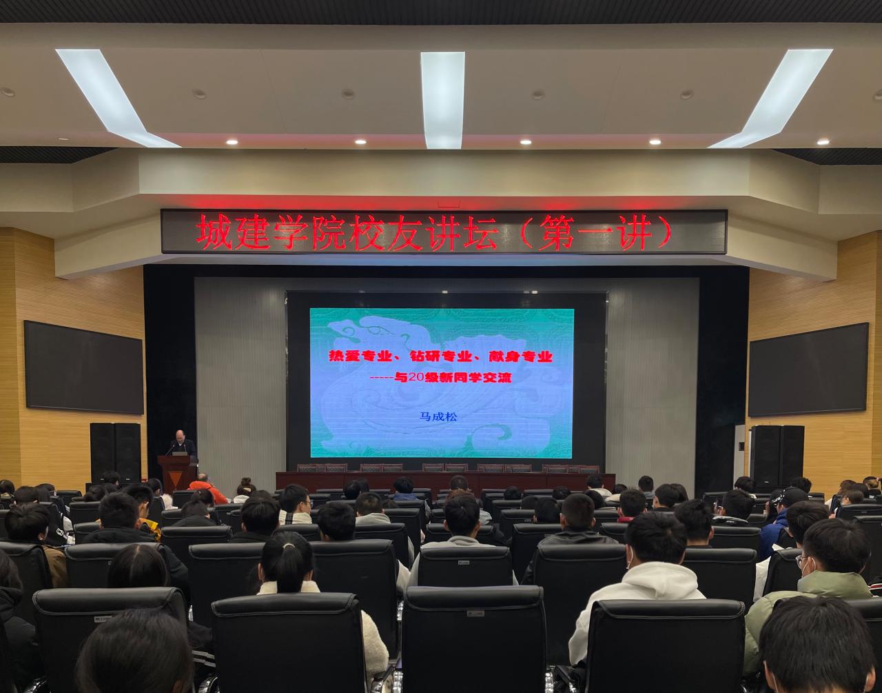 讲座中,马成松教授分享了自己在数十年的学习与从教生活中的所得到的经验感悟,总结出学习土木工程专业的关键是“创业创新,敬业奉献”。他强调道:“土木工程专业能有今天的成就离不开一代又一代土建人的创新与奋斗。”